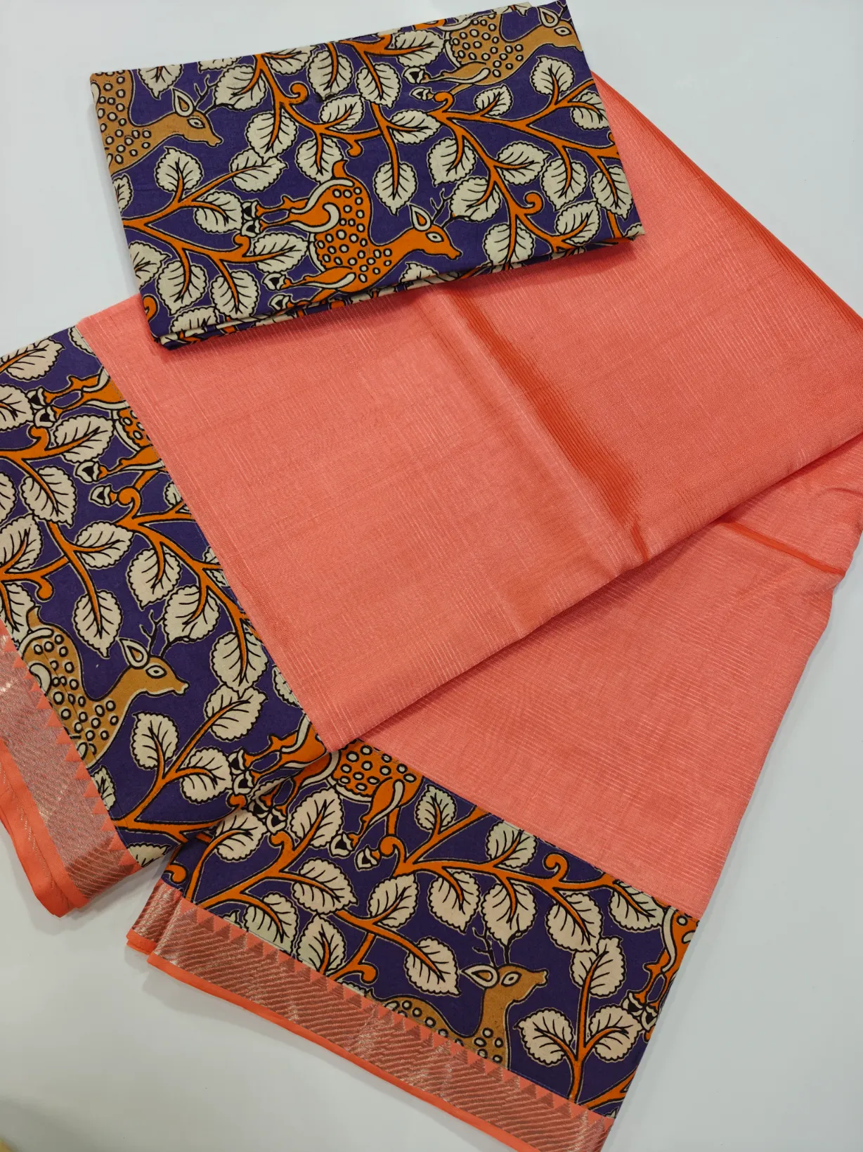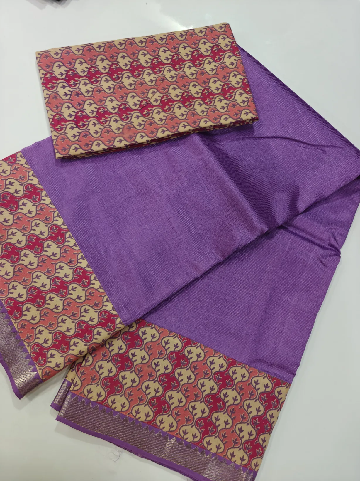 Traditional Mangalagiri Pattu sarees with rich Kalamkari patch work and elegant 50-count zari border, paired with a matching blouse.
